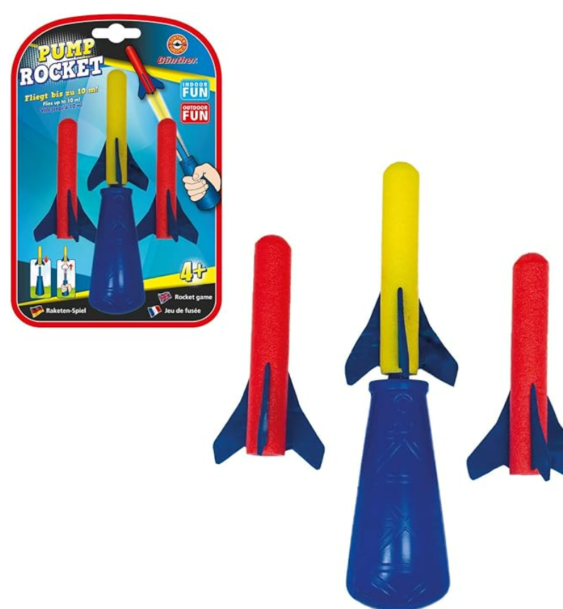Raketen-Spiel Pump Rocket inklusive 3 Schaumstoff-Raketen Fliegt bis zu 10 Meter weit Einfach die Schaumstoff-Rakete aufstecken – zielen – und die Rakete abschießen Fliegt bis zu 10 Meter weit Geeignet für Kinder ab 4 Jahren